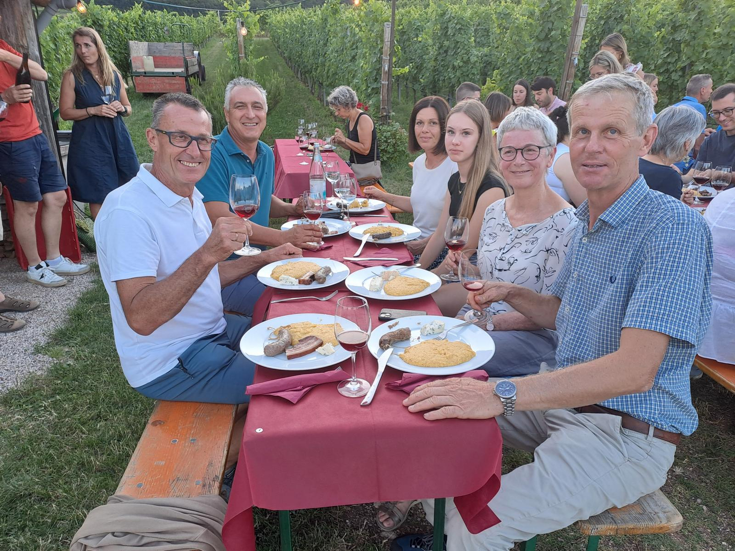 Wir dürfen dieses Fest mitten in den Weinbergen oberhalb des Kalterer Sees feiern. Und natürlich gibt es die Kalterer Leibspeis: Kalterer Polenta mit Wurst, Speck und Gorgonzola, alles vor Ort im Plentnkessel zubereitet. Nicht umsonst trägt die Gemeinde Kaltern den Plentnkessel in ihrem Wappen, und Euch wird ja nicht entgangen sein, dass auch der viva Vinus Weinclub Kaltern den Plentnkessel in seinem Logo trägt! Also ist wohl unsere Plicht, diesen Plentnkessel mal so richtig anzuheizen.