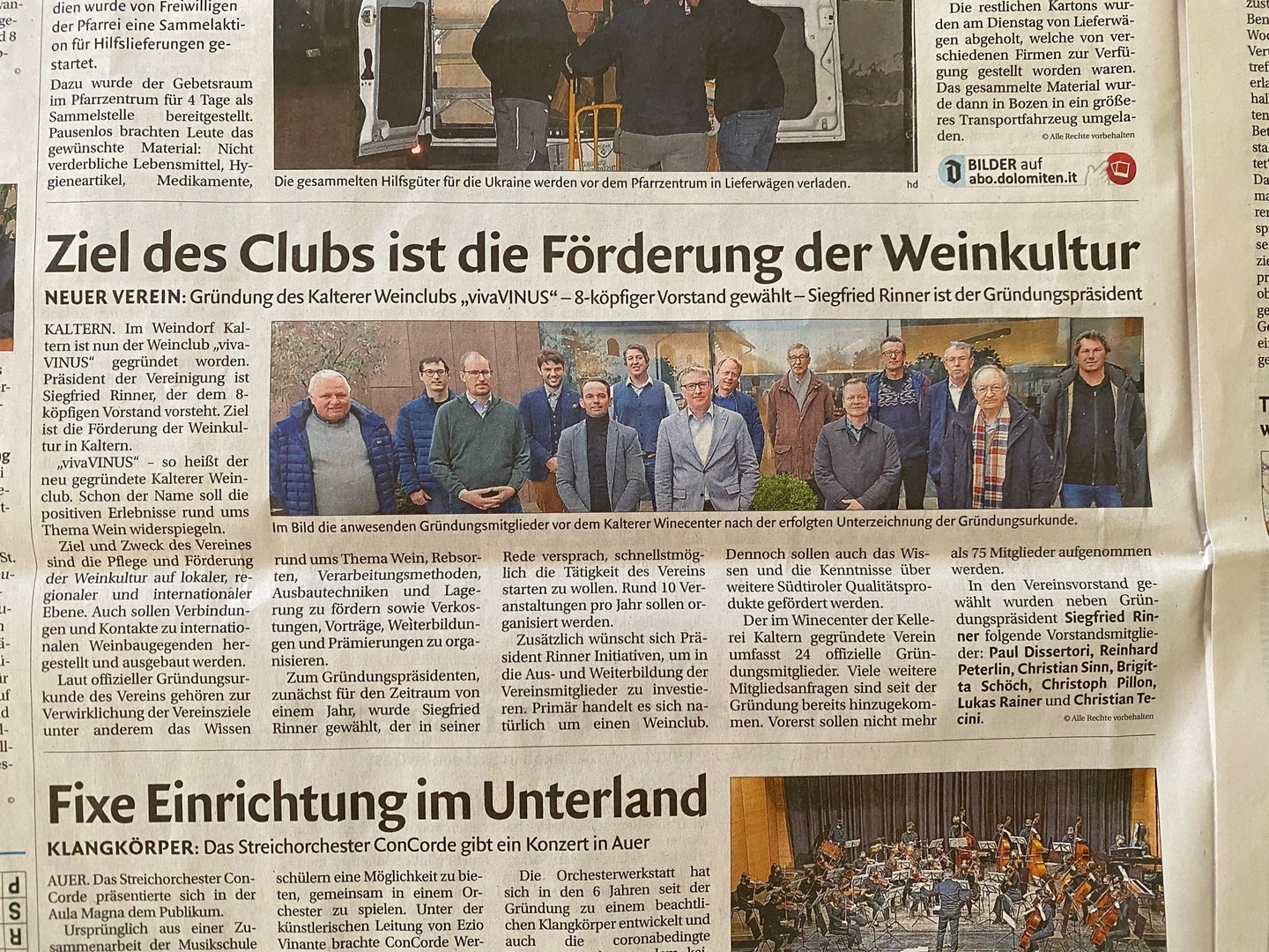 22 Gründungsmitglieder fanden sich am 19. Februar 2022 im Weincenter der Kellerei Kaltern ein. Mit viel Enthusiasmus wurde der Viva Vinus Weinclub Kaltern aus der Taufe gehoben. Der Verein wird die Kalterer und Südtiroler Weinkultur hochhalten und die Südtiroler Qualitätsprodukte in den Mittelpunkt stellen.