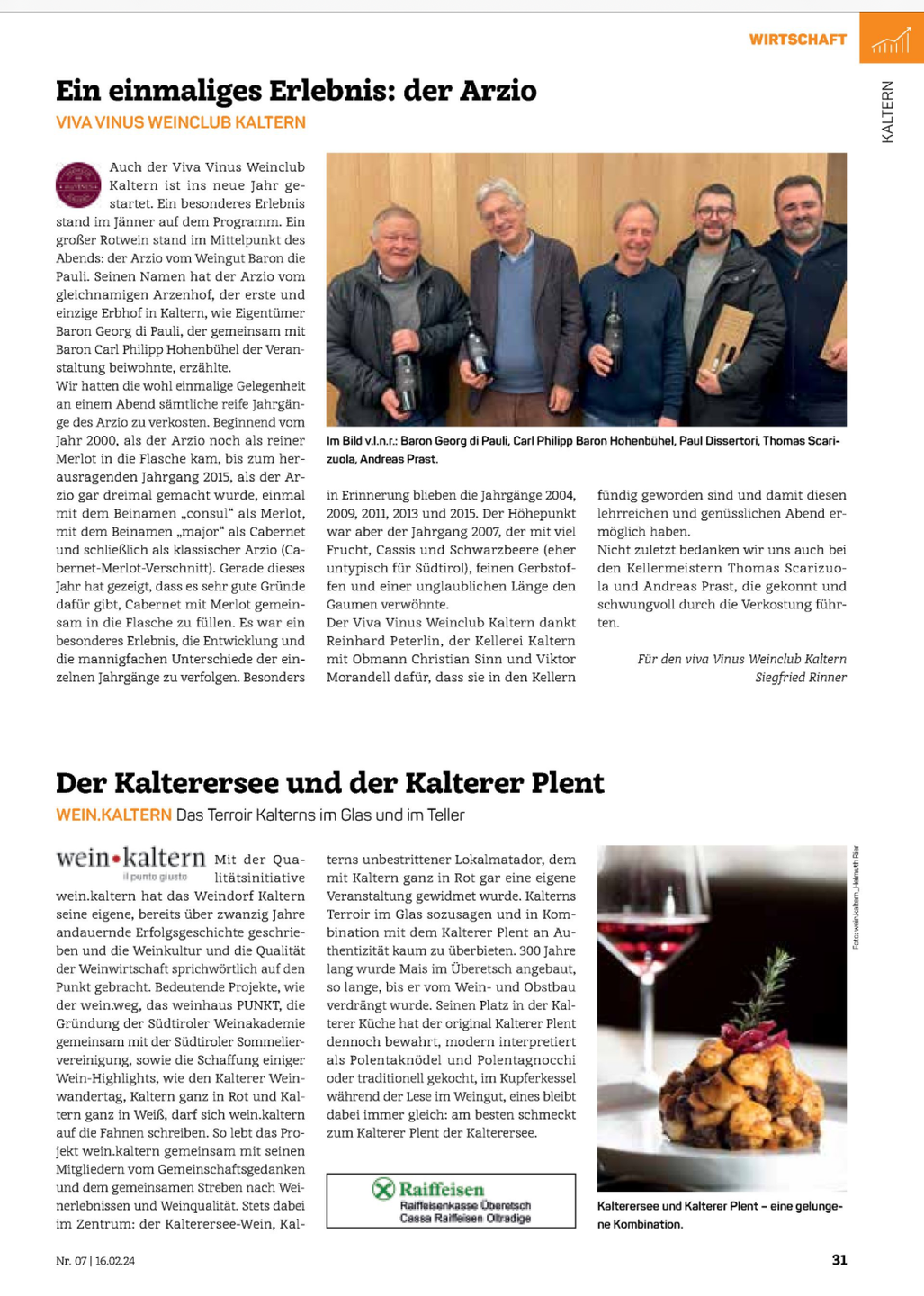 Wir treffen uns am Dienstag, den 23.01.24 bei der Ersten & Neuen Kellerei Kaltern. Die Veranstaltung findet im Verkostungssaal der Ersten und Neuen Kellerei (in der Kellereistraße von Süden kommend das Haus mit dem Glasvorbau, bzw. Glaseingang).