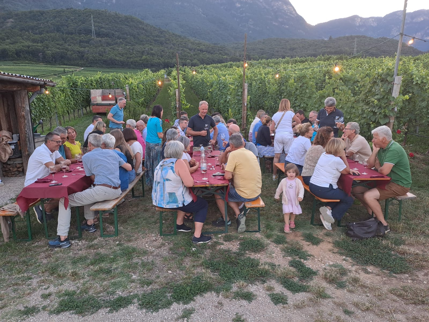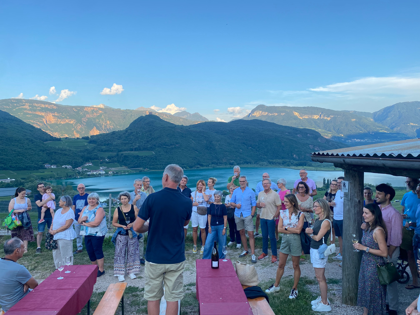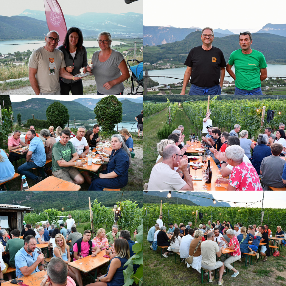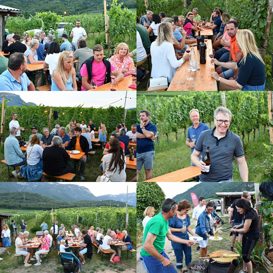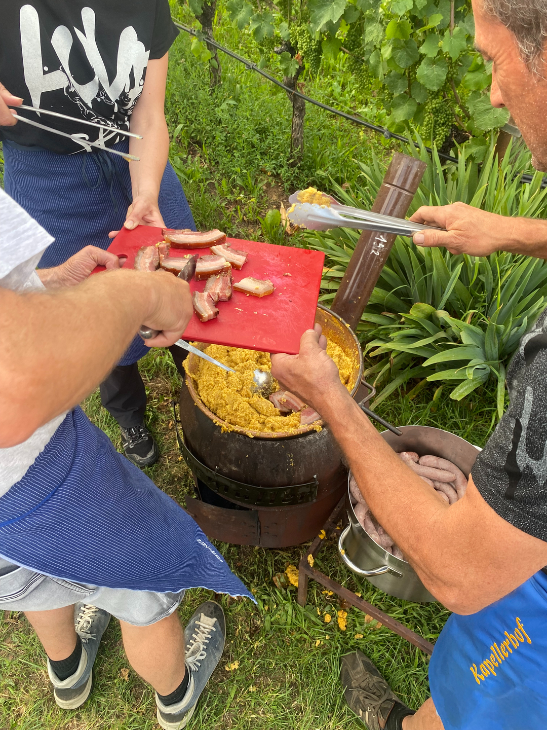 Wir dürfen dieses Fest mitten in den Weinbergen oberhalb des Kalterer Sees feiern. Und natürlich gibt es die Kalterer Leibspeis: Kalterer Polenta mit Wurst, Speck und Gorgonzola, alles vor Ort im Plentnkessel zubereitet. Nicht umsonst trägt die Gemeinde Kaltern den Plentnkessel in ihrem Wappen, und Euch wird ja nicht entgangen sein, dass auch der viva Vinus Weinclub Kaltern den Plentnkessel in seinem Logo trägt! Also ist wohl unsere Plicht, diesen Plentnkessel mal so richtig anzuheizen.