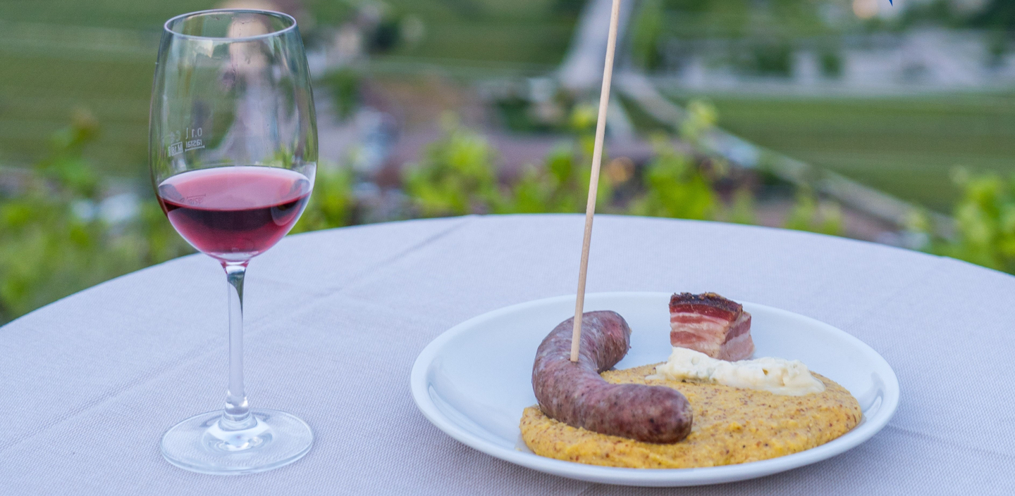Wir dürfen dieses Fest mitten in den Weinbergen oberhalb des Kalterer Sees feiern. Und natürlich gibt es die Kalterer Leibspeis: Kalterer Polenta mit Wurst, Speck und Gorgonzola, alles vor Ort im Plentnkessel zubereitet. Nicht umsonst trägt die Gemeinde Kaltern den Plentnkessel in ihrem Wappen, und Euch wird ja nicht entgangen sein, dass auch der viva Vinus Weinclub Kaltern den Plentnkessel in seinem Logo trägt! Also ist wohl unsere Plicht, diesen Plentnkessel mal so richtig anzuheizen.